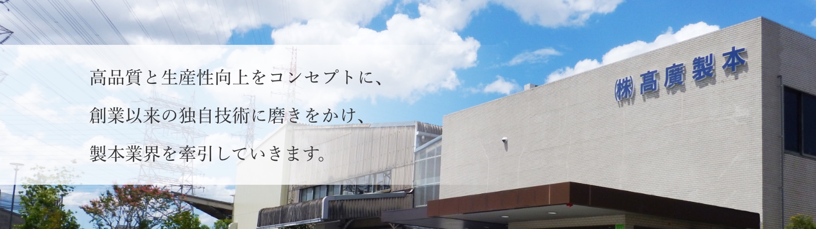 髙廣製本の強み オペレーターのさらなるスキルアップ、新技術や設備機器の開発を進め、スピードと高品質を両立する独創的な生産ラインを実現しています。 詳しく見る 生産設備・製本プロセス 当社の製本設備と製本プロセスをご紹介いたします。 詳しく見る 会社情報 企業理念・会社概要 沿革 採用情報 募集要項 社員紹介