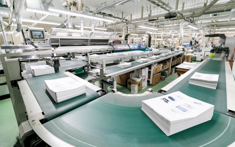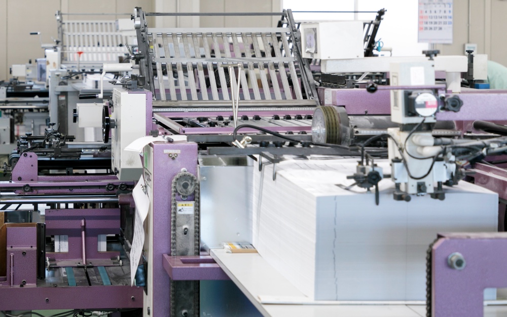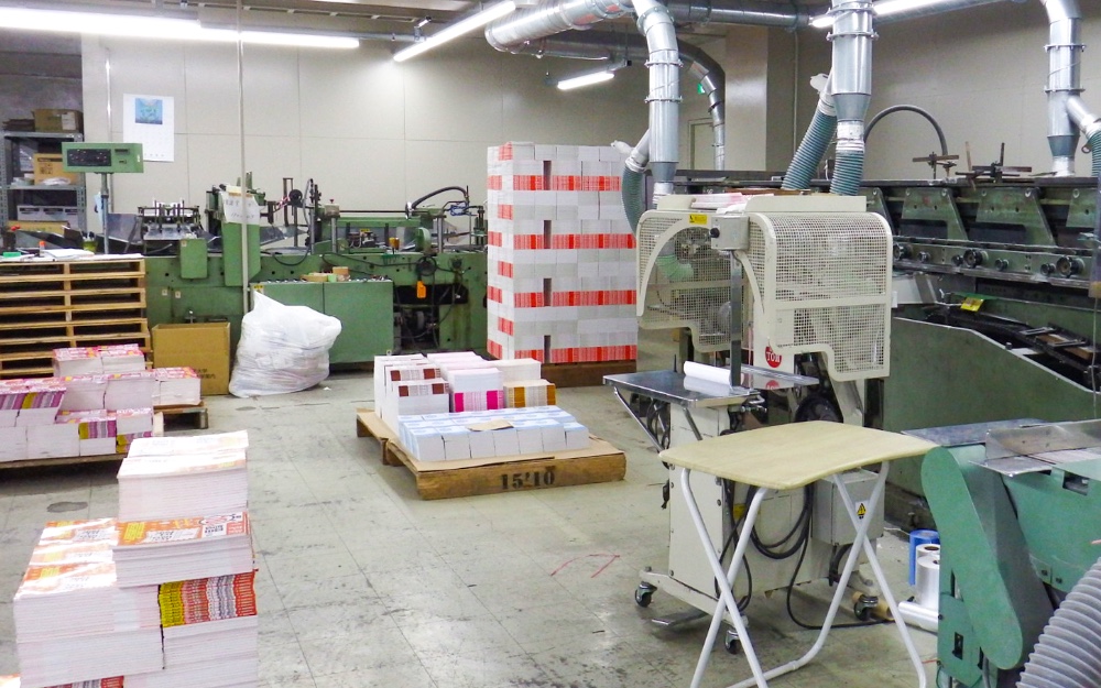 折機30台、断裁機10台、バインダー8ラインなどトータルで製本設備を完備しており、小〜大ロットの生産を臨機応変に対応可能としています。2棟ある倉庫で大ロットの一時保管もしており、広い敷地・駐車場が有ることで10tトラックの出入りもスムーズに行っています。