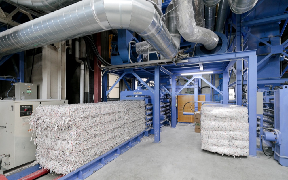 工場内で発生する使用済みの紙などの廃棄物は、工場内のダクトを通じて1箇所に集められ、プレス機で圧縮加工後、リサイクル業者によって完全リサイクルを行っています。